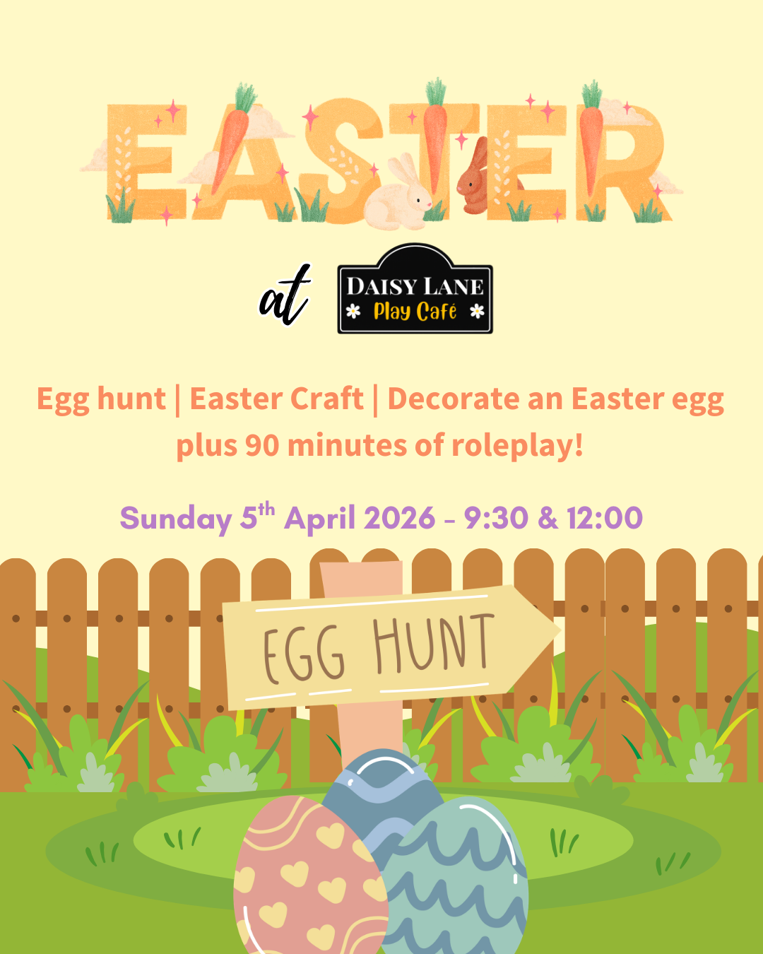 Join us for a special Easter session at Daisy Lane, beginning with a seasonal Easter egg hunt around our roleplay village. Little ones will explore the different areas of Daisy Lane as they search for hidden eggs throughout the session.